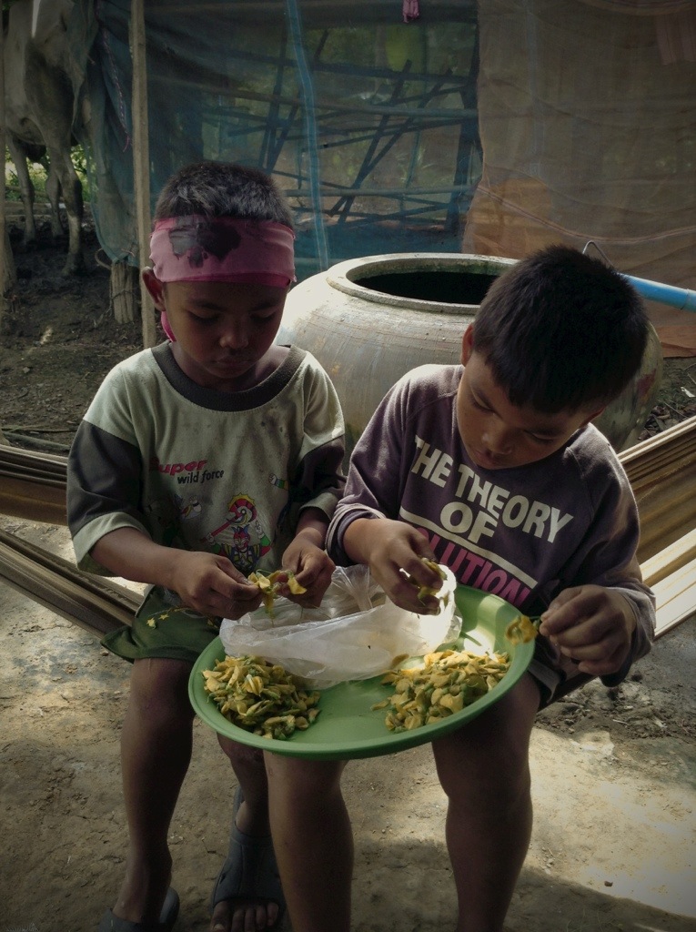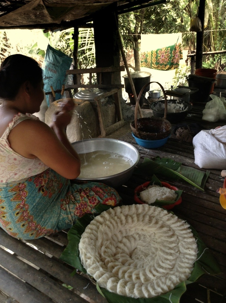 A similar formula to rice paper, just a slightly different process, and requiring a team effort. Once the paste is ground and made, it’s pushed through the small holes into the boiling water, quickly after mum scoops them out with s basket and places the batch in cold water, still cooking slightly and then pours them into her sorting bucket, whilst her children prepare some vegetables (apparently?) to combine with the bubbling away soup.