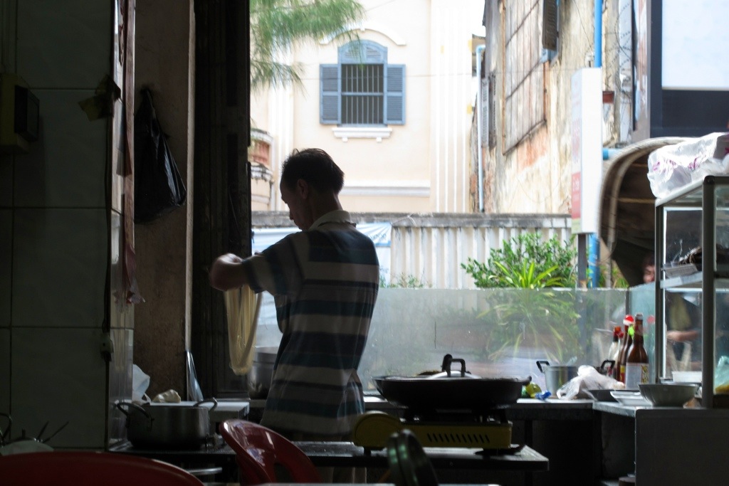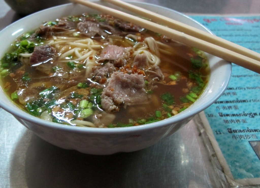 On my first night in Battambang I ate dinner at this Cambodia noodle house, Lan chorv Khorko Miteanh. This man hand made the noodles on order for each of the meals. Here is “Chinese noodle soup with beef” as suggested by one of the Cambodian boys (there was intestine soup on the menu, which definitely did not take my fancy). I was the only westerner here, which was cool I thought.