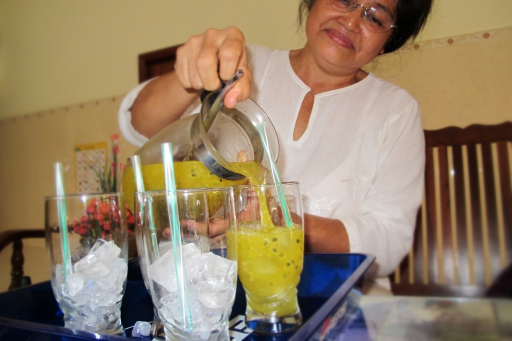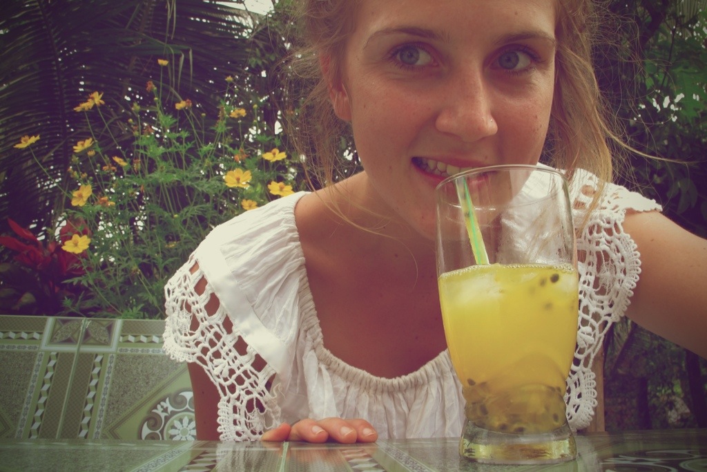 Socheat (sot chit is how it’s pronounced) had been asking us how we eat passion fruit and I had tried to explain the concept of pavlova or on fruit salad, and she said so never as a drink? A drink!? Well now I understand its glory, passion fruit, sugar, honey and ice and voila, heaven! Already ready and waiting for us to arrive! The only way to consume passionfruit from now on!