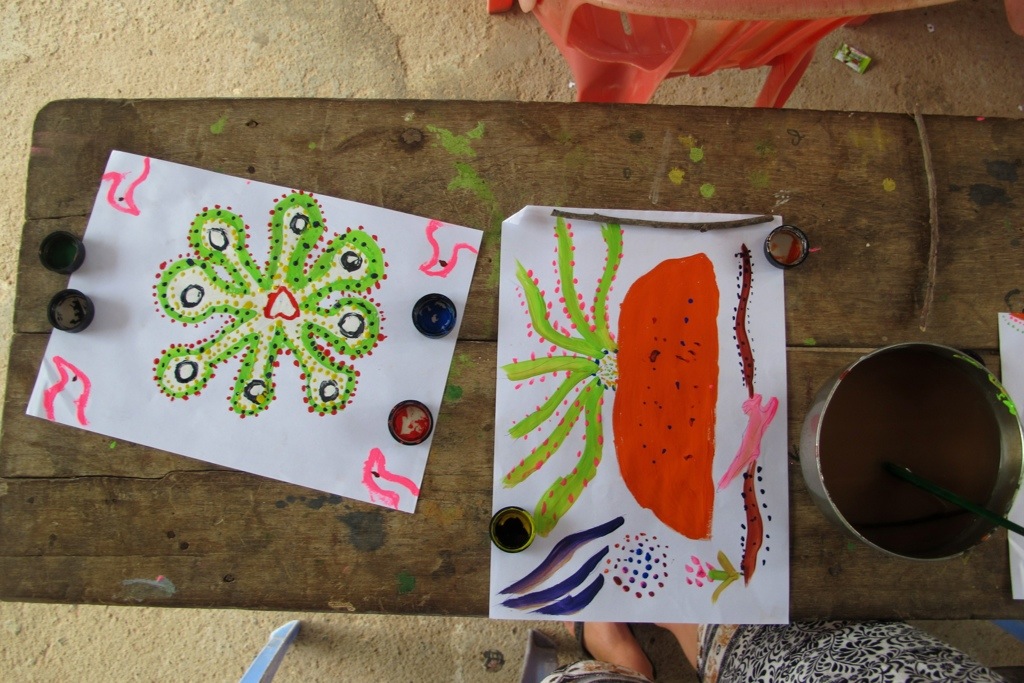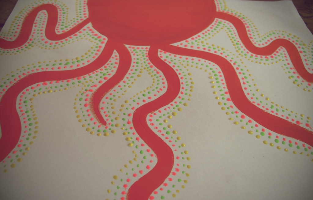 Inspired by nanna and her love for indigenous Aboriginal artworks, I decided to teach the older kids a lesson on Australian culture. Afternoons they have in their head that all we will do is colouring in, but I try and mix it up with craft as well and keeping it a little educational-especially the more advanced older kids, so we wrote and read a bit about aboriginal culture, and I showed pictures on my iPad, explaining the techniques of their art work. We then used sticks, the tips of paint brushes and our fingers to create our masterpieces pictured.