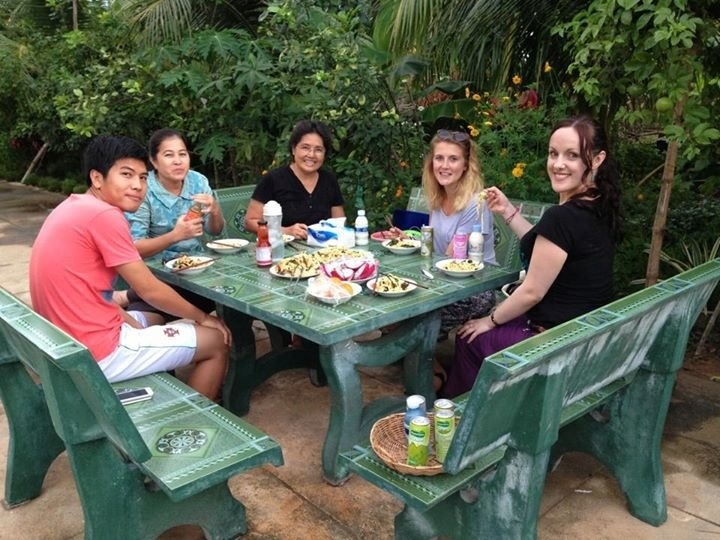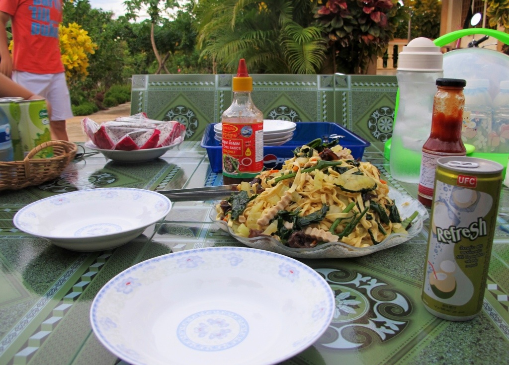 We thought we were going on a girls night out for dinner with Socheat, but when we got home from school she told us her aunt loved us so much and has cooked us fried noodles and wants us to come for dinner (she’s a vegetarian too-first Cambodian vegetarian I’ve met). She made us a delicious spread of fried noodles a vegetables, most of which were from her own garden, as well as home grown dragon fruit and a very strange orange fruit which was almost like sweet pumpkin, the texture was the hardest part to get our head around. Thankful for something other than rice, and feeling very welcomed we had a big family dinner outside and it was so incredibly lovely and generous. She also makes home made soy milk which we tasted yesterday and loved so we had a second batch of that to take home, more passion fruit and she picked us a new grapefruit cause we had told her who much we loved the first one. An experience like this with locals is exactly the reason I am so thankful for where I have been placed. Cambodia’s are the most generous humans, our kids will carry all our bags and umbrellas and books, and we’re always offered mountains of food and gifts from kind new friends, even those that don’t have much, here they go above and beyond for you and it’s the most wonderful feeling. One day I hope to return here, and re-visit all my children (hopefully sponsor one- though that will be a tough choice) and have the big welcome back party on Mrs. Laymeng’s top veranda that we’ve been promised. Hopefully not alone next time 😀