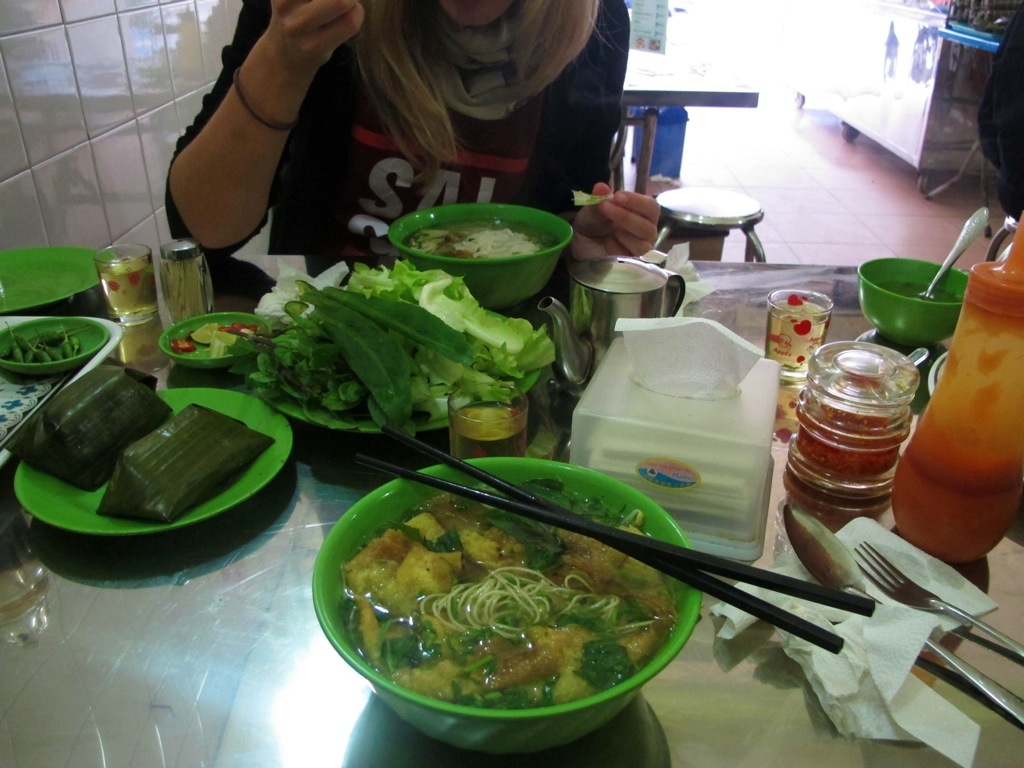 Shortly after this photo was take of our amazing and cheap and chips meal (literally 3.50 for all of us) I picked up chilli to add to my amazing wonton noodle soup (shock horror!) and then blew my noes, just touching my noes so for this entire meal just under my noes was on FIRE and Olivia had to go all mother-like on me so that I stopped touching it and making it, if it was even possible, worse! This cafe has been our budgets saviour here, we’ve returned at least 4 times since bing in Da Lat, and who wouldn’t when you can get $1.50 plates of piled high (unusual) Vietnamese vegetarian goodness, $1 soups and 4 fresh vegetarian spring rolls for 50 cents. Winners are grinners!